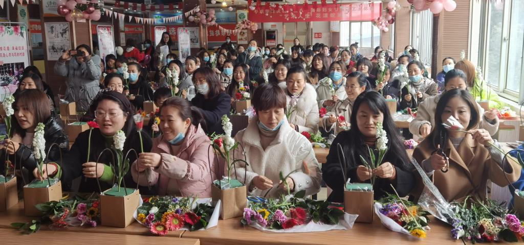 3月8日上午,校工会组织女教职工们在学校餐厅开展了“艺术人生 花漾绽放”插花艺术体验活动。在插花老师的指导下,女教职工们对花材进行修剪,将玫瑰、康乃馨、黄莺及栀子叶等等进行了精心的搭配,巧手修枝剪叶、搭配色彩,细致地置入花篮,一束束错落有致、色彩鲜艳、造型各异的插花作品展现在大家面前,寄托着大家对美的理解和对幸福的感悟,含苞待放的花束与笑靥如花的老师们交相辉映,格外美丽。整个活动现场欢声笑语,其乐融融,女教职工们都沉浸在亲自动手创作的乐趣和插花艺术带来的快乐中。