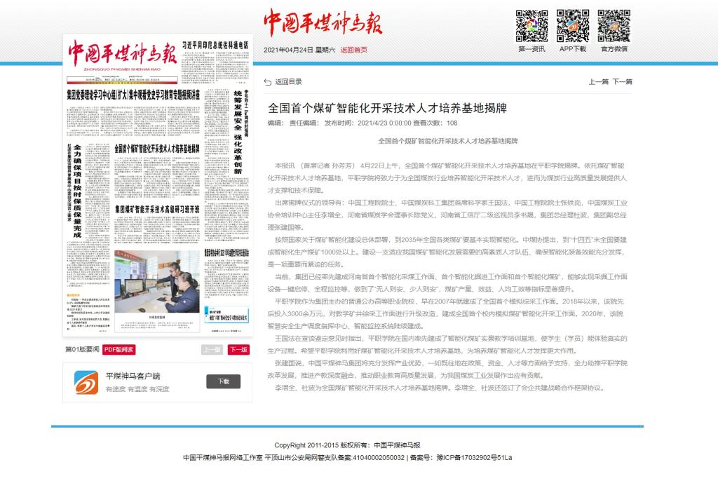 本报讯 (首席记者 孙芳芳) 4月22日上午,全国首个煤矿智能化开采技术人才培养基地在平职学院揭牌。依托煤矿智能化开采技术人才培养基地,平职学院将致力于为全国煤炭行业培养智能化开采技术人才,进而为煤炭行业高质量发展提供人才支撑和技术保障。