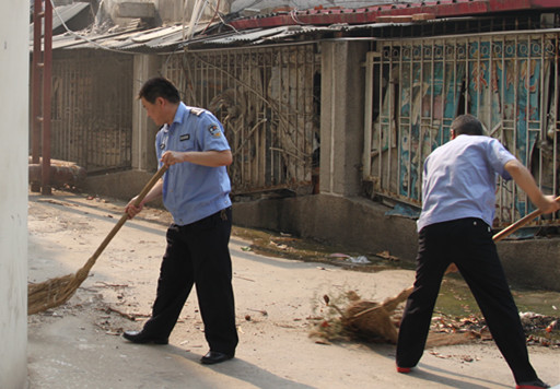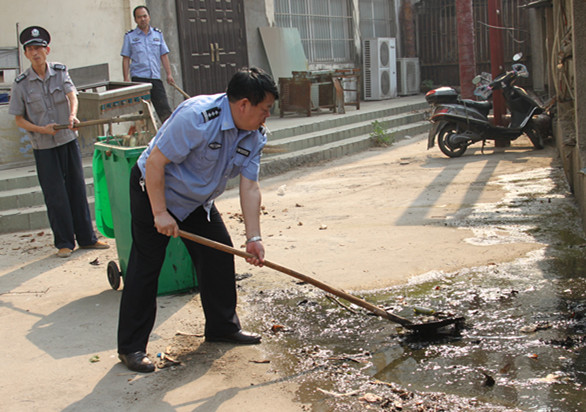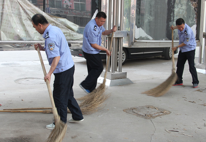 2014年6月10日上午,武装保卫处组织全体党员开展义务劳动, 打扫南大门围墙以内东侧的环境,经过近四十分钟的劳动, 清理垃圾6桶, 保持了环境卫生干净整洁。