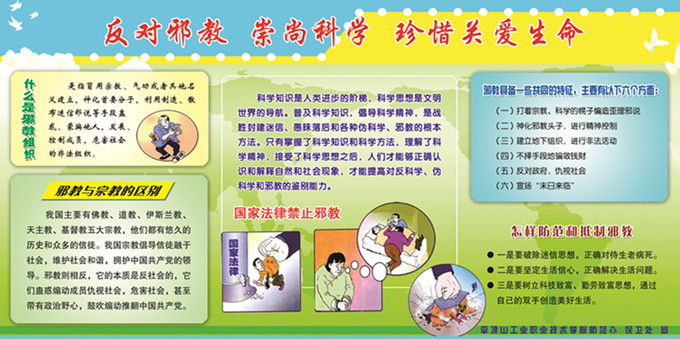 通过图板展示、张贴宣传画、发放资料等方式,向师生宣传什么是邪教、邪教与宗教的区别、邪教的特点、如何防范和抵制邪教,详细讲解以 “法轮功”、 邪教“全能教”为代表的邪教组织的种类、特点、现实危害和潜在威胁,普及如何防范邪教知识,宣传党和国家坚决打击和取缔各种邪教组织的政策和法规,在校园内营造浓厚的反邪教警示教育宣传氛围。(王天胜)