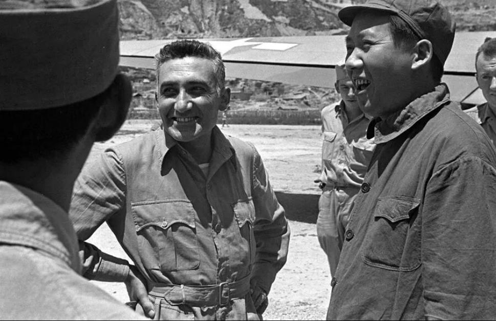 1944年,毛泽东同志和马海德在延安。在抗日战争和解放战争期间,马海德曾接待过许多到延安访问的外国记者、外交官、军人,包括1944年驻华美军司令史迪威将军派驻延安的美军观察组 新华社图片