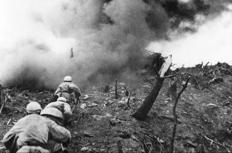 1952年,在上甘岭战役中,中国人民志愿军指战员在炮火支援下,攻上537.7高地北山。 新华社图片