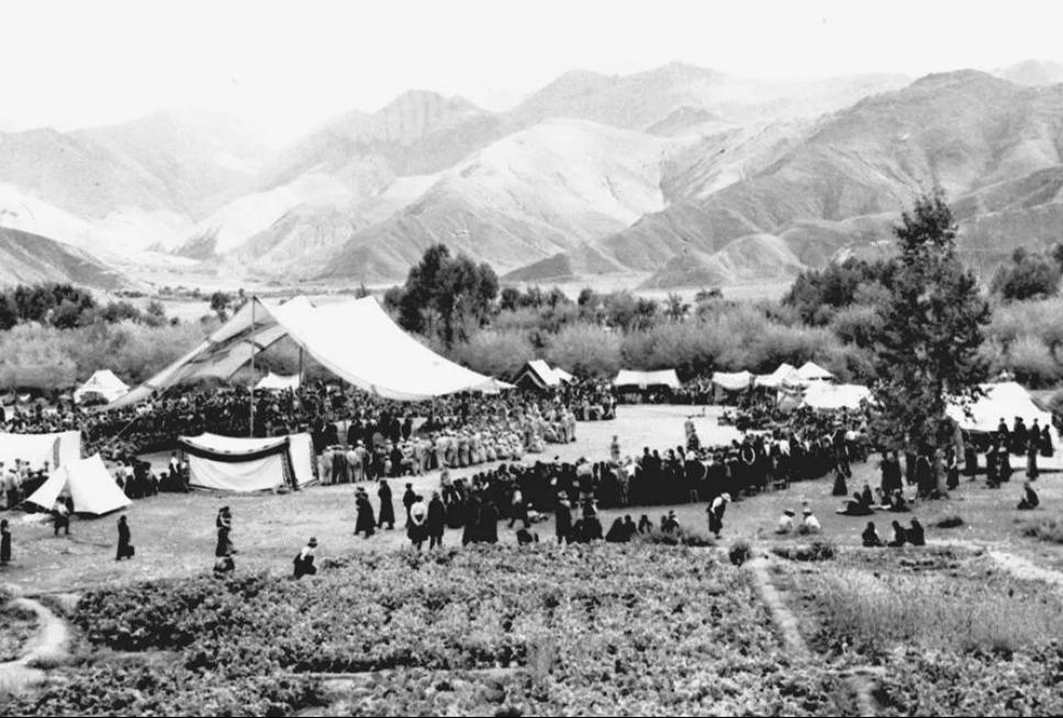 1951年9月,人民解放军入藏先遣部队抵达拉萨城郊。西藏地方政府在拉萨河畔搭起了巨大的白色帐篷,设立了十里长亭,隆重热烈欢迎解放军入城。 新华社图片