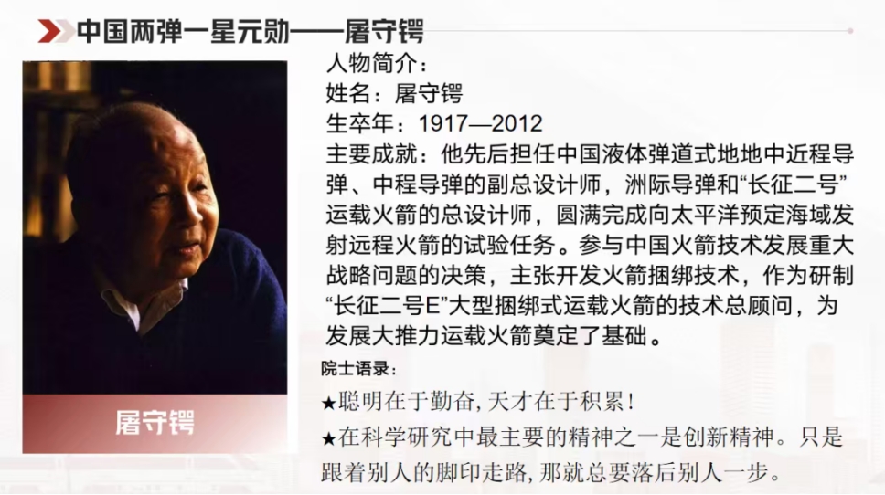 “两弹一星” 事业,是新中国在一穷二白的废墟上筑起的实力丰碑,是中华民族挺直腰杆的关键一跃。而屠守锷,正是这一伟大征程中不可或缺的 “筑路人”。作为中国航天事业的开拓者之一,面对国外技术封锁与国内物资匮乏,他带领团队用算盘验算数据、从零绘制图纸,扎根戈壁攻克难关。从参与制定导弹总体方案,到主持研制中国第一枚地地导弹 “东风一号”,再到攻克 “两弹一星” 发射中的无数技术难关,他始终将个人理想熔铸于国家命运。当导弹划破戈壁长空、卫星遨游浩瀚天际时,屠守锷的名字早已与中国航天的崛起紧密镌刻在一起,成为“自力更生、艰苦奋斗、大力协同、无私奉献、勇于登攀”的“两弹一星” 精神最生动的注脚。