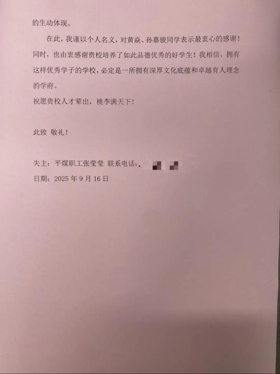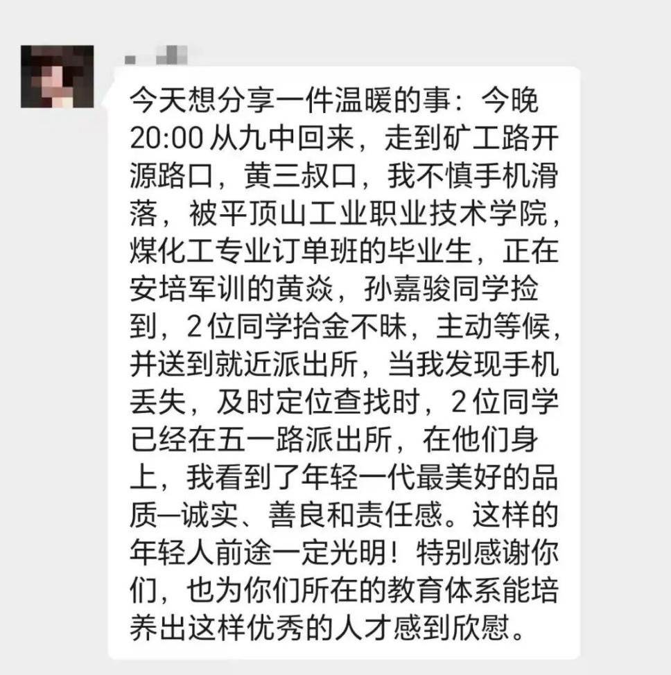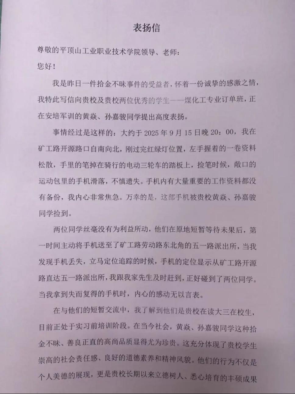 失主张莹莹女士发现手机丢失后,通过定位查找,得知手机已在派出所,便迅速前往。当拿到失而复得的手机,张女士内心满是感动。手机内存储大量重要工作资料,若丢失将造成极大损失。为表达感激,张女士特意撰写表扬信,向学校及两位同学致谢,称赞他们展现出诚实、善良与责任感,是年轻一代的榜样。