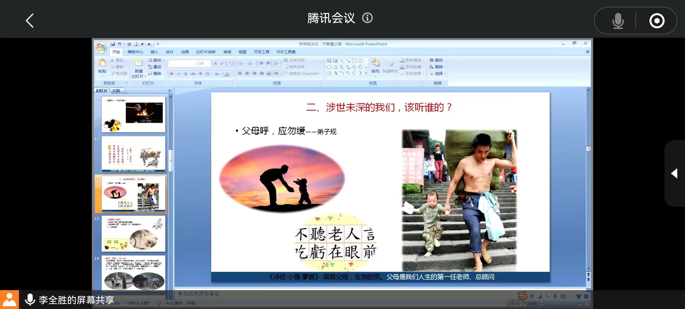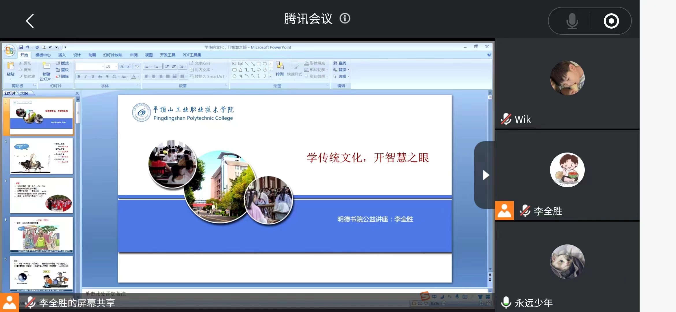 讲座中,李老师用朴实幽默的语言,经典的案例和大量珍贵图片资料引入主题,引经据典、通俗易懂地对《弟子规》、《论语》等经典内容进行了解读。在品读道家智慧课程的讲解中,插入大量生动的现实素材,使学生们意识到谦卑求知、虚怀若谷的重要性,以现实生活为例教导大家修养“周而不比”的君子品格。从小到“说一句话”的说话之道,大到“学一技之长服务社会”的立身处世之道,娓娓道来……讲座中妙语连珠、幽默风趣,引起学生一片点赞之声。