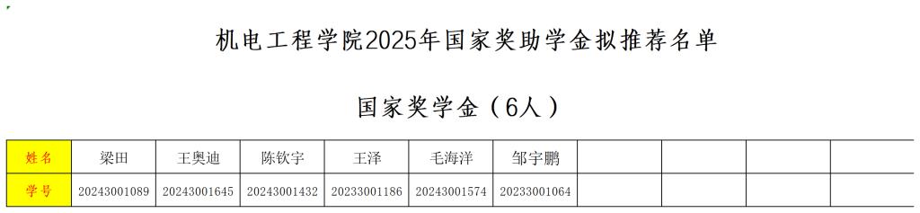 根据《教育部等六部门关于做好家庭经济困难学生认定工作的指导意见》(教财〔2018〕16号)和河南省教育厅《关于印发河南省家庭经济困难学生认定工作实施办法的通知》(豫教财〔2019〕84号)及《平顶山工业职业技术学院关于做好2025年高校学生国家奖助学金评审发放工作的通知》等文件规定,经学生本人申请、班级评审小组评审及班级公示、院系审核等环节,现将机电工程学院2025年度国家奖助学金拟定名单予以公示。
