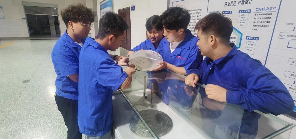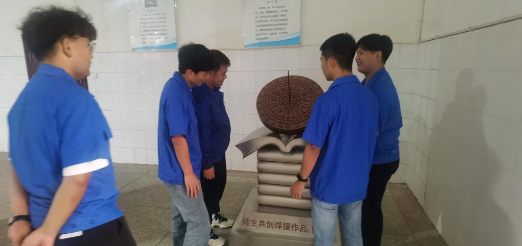 师生共同创新设计制作焊接工艺品-日晷,整个焊接作品制作过程复杂艰辛,从手工画图到三维设计优化,再到下料、划线、切割、装配、焊接、纯手工刻字打磨、打蜡防锈,作品焊点达到5万多点,打磨刻字工序超过二十个小时。作品的主体由基座、托架、日晷三部分组成,基座象征着工匠夯实技能的根本,托架的书是引用学校的雕塑女神像的底座,象征着知识的摇篮,日晷则代表着中国的传统文化,更象征着严谨求学、与时俱进的精神,整个作品将历史文化与校园文化相结合,寓意莘莘学子要珍惜时光、踏踏实实做人、注重知行合一。