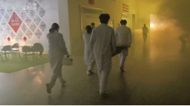 救助人员发现“受伤人员”后,有条不紊地将假人抬上担架,在火势蔓延的紧迫下,快速且安全地逃出危险区域,到达安全地带后,立即对“受伤人员”做急救处理。