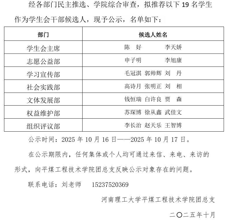 河南理工大学平煤工程技术学院学生会第九届学生会候选名单