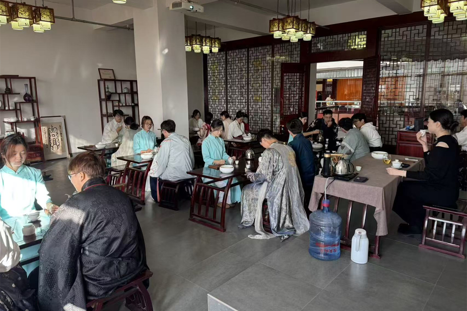 活动现场亮点纷呈,各体验区人气高涨。茶艺室内,高级茶艺师李慧璐老师现场授课,体验者亲手完成温杯、置茶等流程,在茶香氤氲中体悟东方雅致;射箭区,学生们凝神拉弓,于规范动作中感受“射以观德”的传统理念;飞花令环节,大家围绕关键字轮番对答,诗词佳句信手拈来,尽显文化底蕴;书法区,书法爱好者挥毫泼墨,篆隶楷行各展风采,传递汉字艺术魅力;古乐室里,悠扬曲调引人驻足,同学们拨弦抚琴,感受传统乐器的独特韵味。