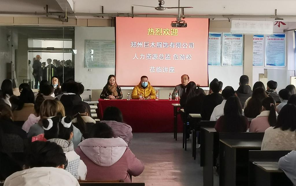 12月10日,艺术学院校企合作定向班宣讲会在实训楼设计实训室举办。郑州巨木服饰有限公司人力资源部总监危继松、副总监曹亚萍及相关工作人员、艺术学院负责人、服装专业教师和2019级120名学生参加了讲座。