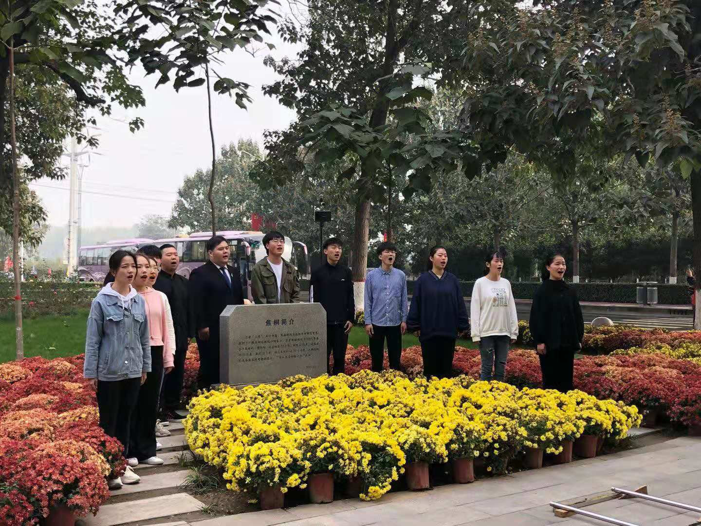 在参观、学习的过程中,学生们渐渐理解了这首歌的内涵。在黄河最后一转弯大堤上,夕阳西下,学生们看着黄河岸边的落日美景,情不自禁地唱出了“在此,最后一转弯”;在焦裕禄书记亲自栽下的焦桐树下,“枯枝蔓槎壮山河”,学生们不由自主地深深鞠躬、深情歌唱……
