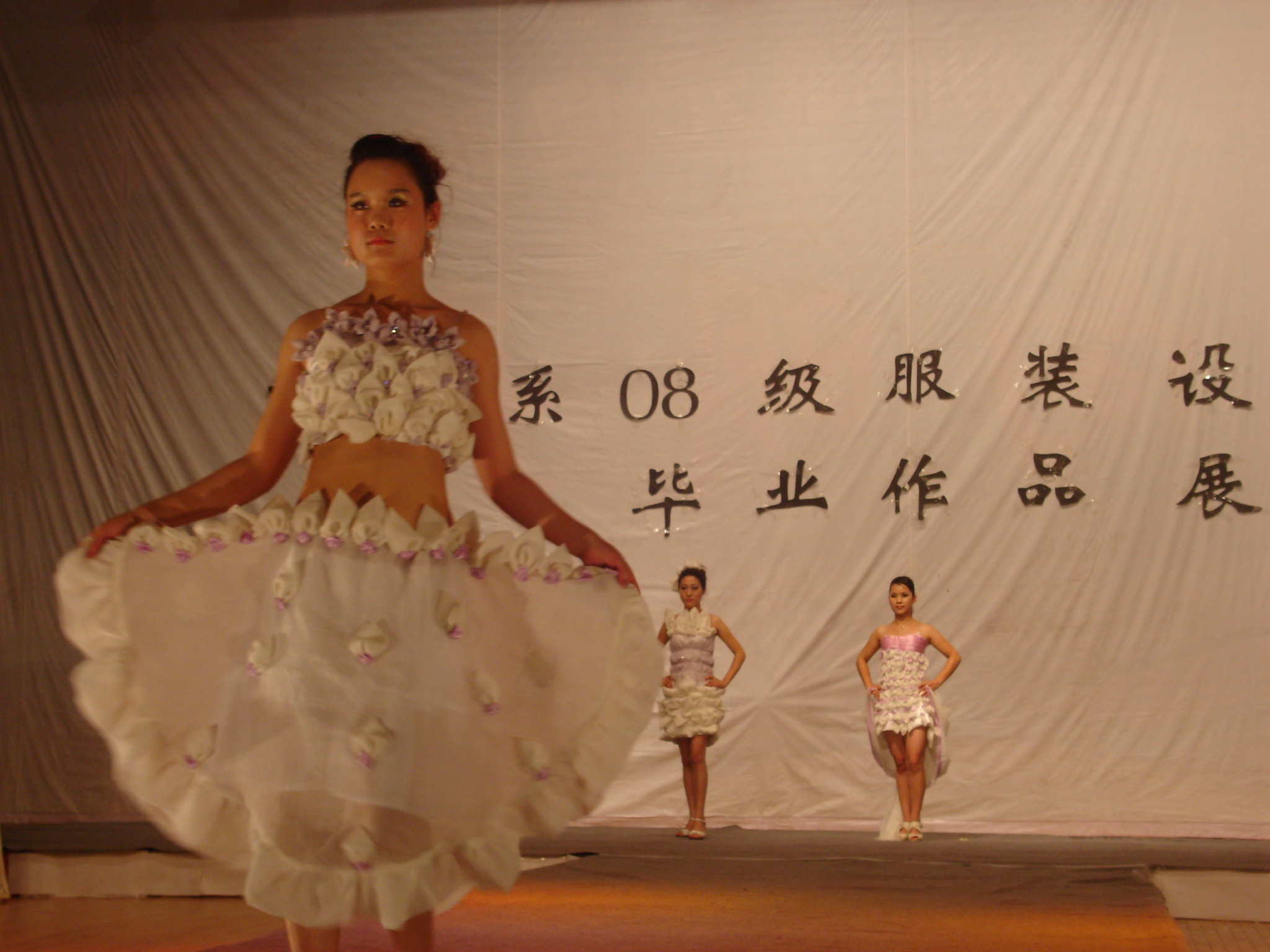 毕业作品充分表达了学生在三年的学习生涯中对服装设计的深刻理解,折射出新生代设计师对时尚与生活的敏感把握,对艺术与技术表达的成熟思考。从展出作品来看,学生们的设计有的侧重于现代艺术符号的建构与表达,有的则更加关注作品的实用性与商业价值。整个展演呈现出一种轻快自如的氛围,与以往的学生作品相比,更多的体现了探索性、实验性的特点。在创作设计过程中对服装每一个细节的表达都可以看到设计中的生动语言,无论是一把小梳子,一张塑纸,一根细羊毛在我们的学生手中自然的转换成一套套时尚美丽的个性时装。其中,刘雪等人的作品《space age》、 刘文平等人的作品《异域风象》、 孟洋洋等人的作品《若水》脱颖而出,赢得在场观众的一致好评。