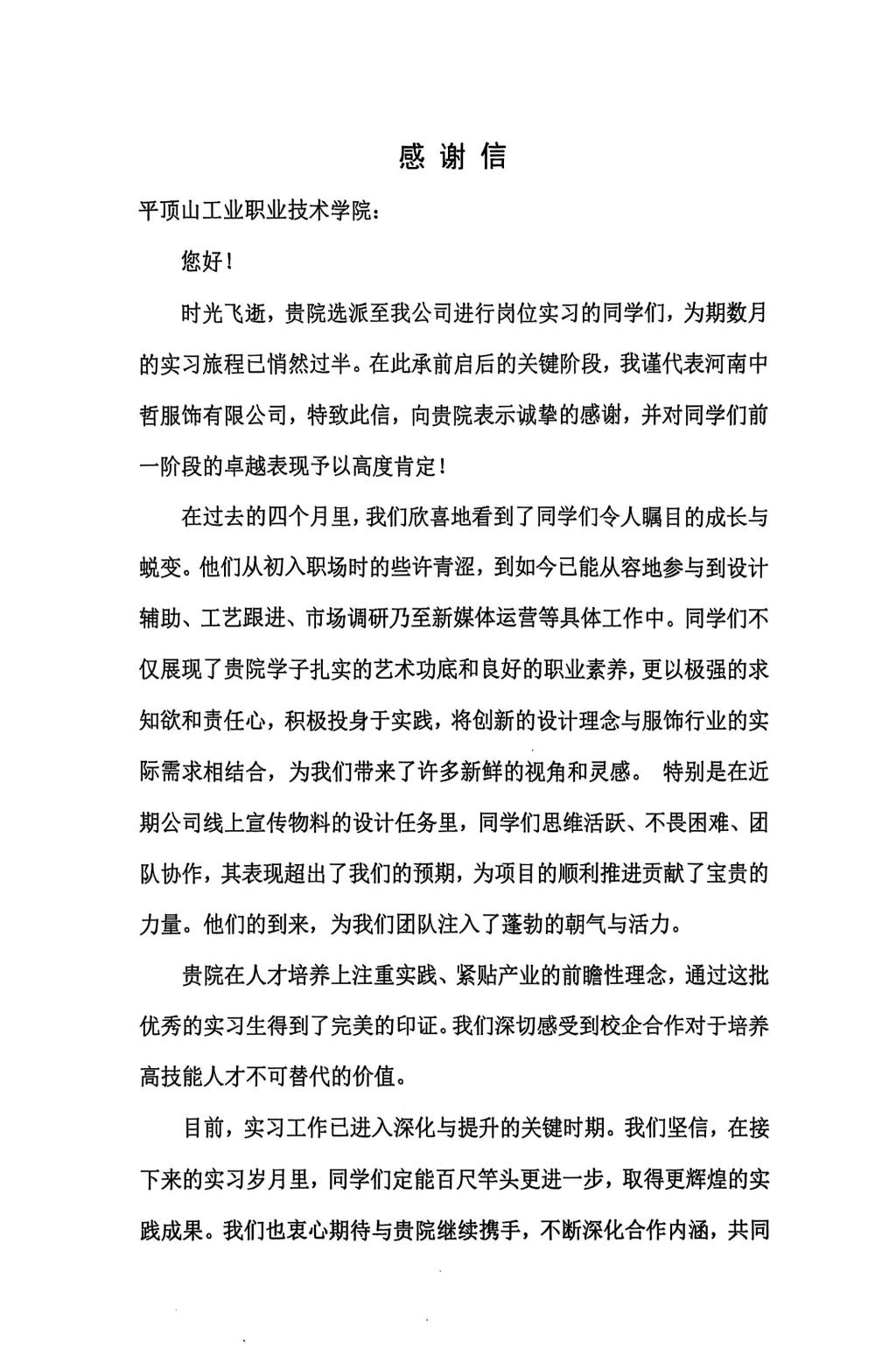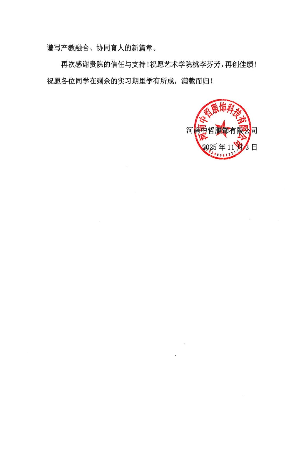 这封感谢信是对我院长期以来坚持“实践育人、产教融合”办学理念的生动印证与积极反馈。我院将继续与河南中哲服饰有限公司保持紧密沟通,做好实习生的后续管理与服务工作,并以此为契机,进一步拓展校企合作的广度与深度,共同探索人才培养的新模式、新路径,为行业与社会输送更多高技能艺术人才。