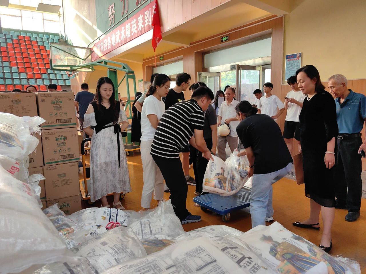 校工会十分重视这次职工节日福利发放工作,抽调细心的工作人员发放中秋福利,确保把实事办实、好事办好。在综合体育馆发放现场,各个部门有序领取,一壶油、一袋面、两包米,心中起春意。