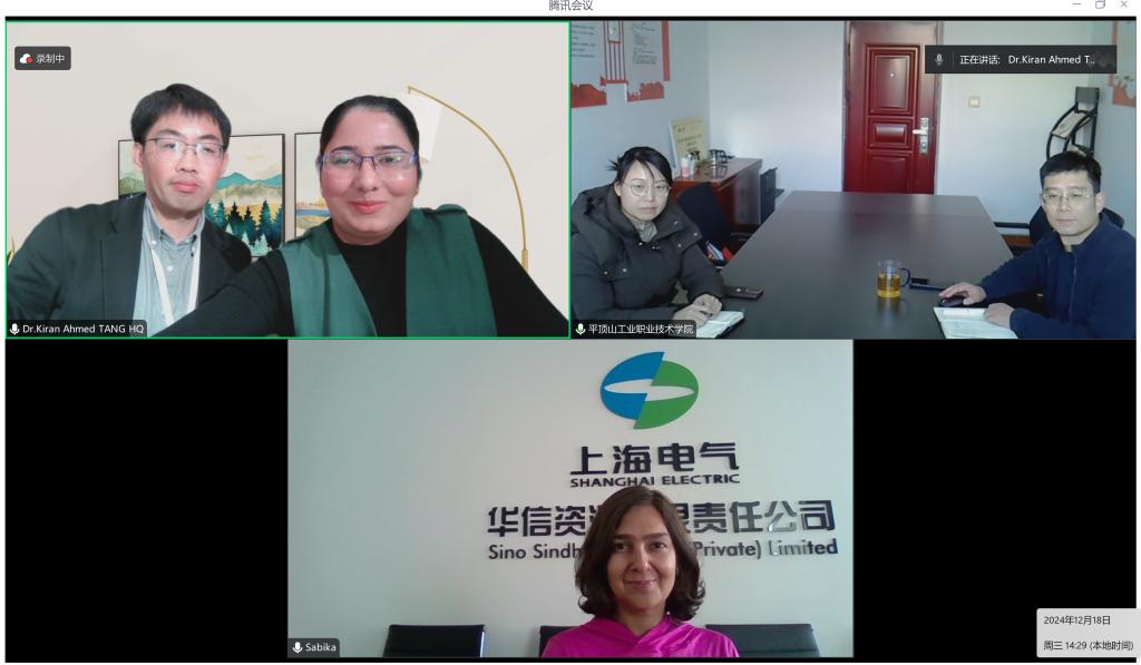 12月18日下午,国际合作学院组织与上海电气巴基斯坦华信资源有限责任公司召开线上会,国际合作学院相关人员、该公司行政部的高级沟通经理苏美雅·哈莉德及唐风国际教育高级经理等参加会议。