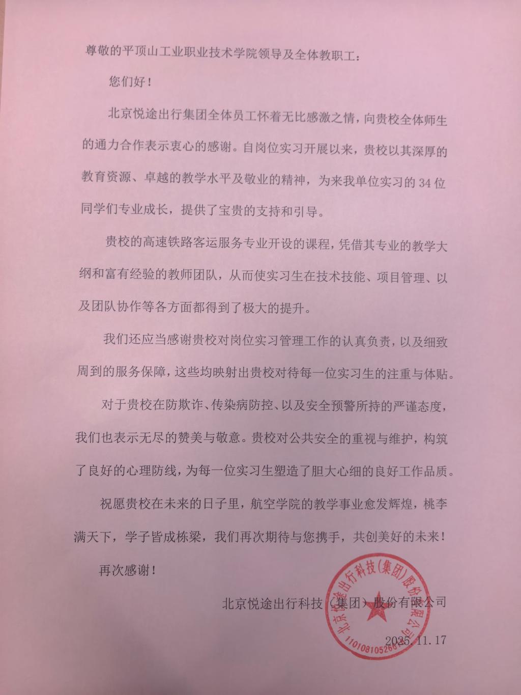 近日,航空学院接到北京悦途出行集团发来感谢信,对学校高速铁路客运服务专业张伟业、齐思甜、鲁宁等34名实习生在岗位实习工作中的卓越表现给予了高度评价,并对航院能输送大量高素质技术技能人才表示衷心感谢。