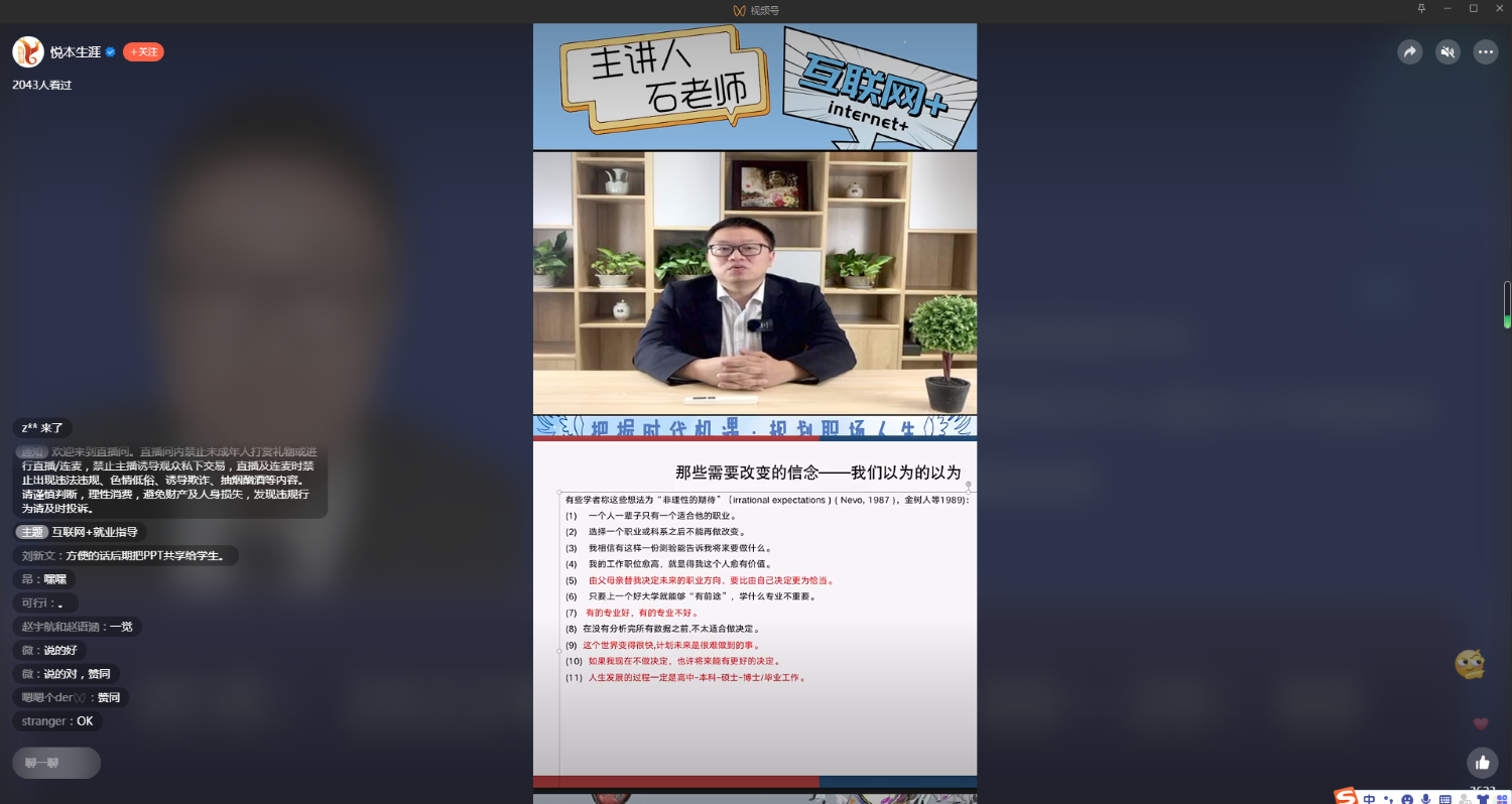 本次讲座邀请重庆市生涯规划促进会副秘书长、中国民族书画院美育研究中心重庆工作站站长、NCDA国际生涯发展规划师—石峰老师,做了题为“把握时代机遇,规划职场人生”在线就业指导讲座,我校5200余名学生在腾讯会议会场聆听了讲座。