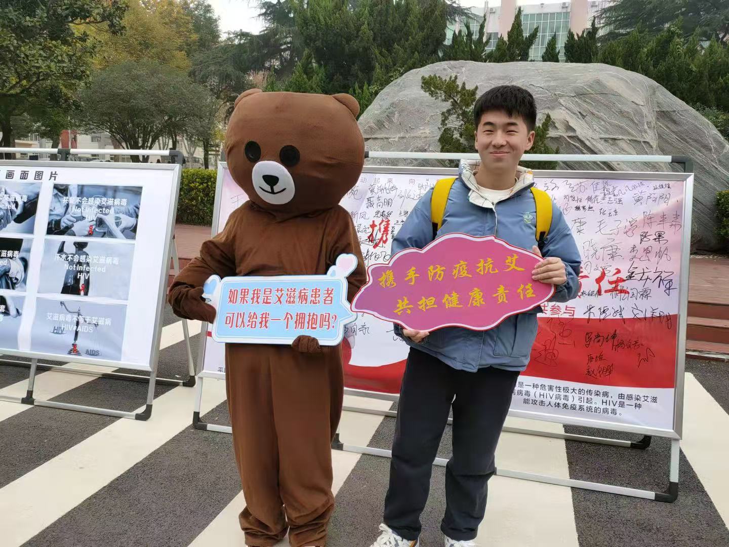 活动前,卫生所与院前急救队成员提前在学校南大门悬挂了世界艾滋病日主题横幅以营造良好的宣传氛围。活动中,工作人员通过现场签名、摆放防艾知识展板海报、熊人偶拥抱、设置专家咨询台、发放宣传手册等方式向来往同学宣传防艾政策、预防知识等内容,同时现场发放了艾滋病宣传材料5000余份和小礼品2000余个。