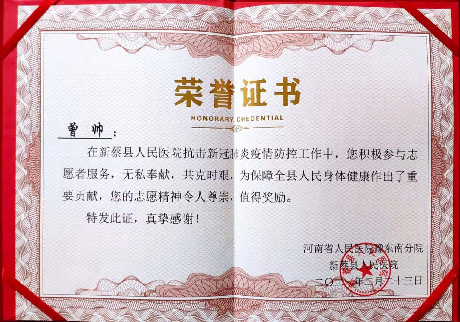 19级护理8班的曾帅同学,自入校以来,团结同学,尊敬师长,勤奋刻苦,连续获得“优秀学生”、“优秀团员”和“国家励志奖学金”等荣誉。在春节期间,曾帅主动加入河南省新蔡县人民医院的志愿者队伍,参与了新蔡县人民医院的新冠肺炎疫情防控门诊区卡点值守工作,工作中不惧困难,认真负责,用行动为家乡的安全贡献着绵薄的力量。