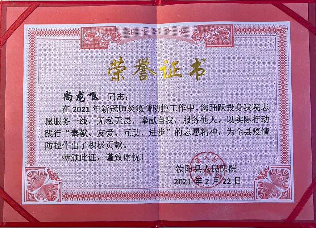 近日,汝阳县人民医院和新蔡县人民医院分别召开了疫情防控志愿者表彰大会。我校护理学院的尚龙飞同学作为汝阳县人民医院的志愿者、曾帅同学作为新蔡县人民医院的志愿者,在各自志愿服务的医院的疫情防控工作中做出了突出贡献,受到了来自医院的表彰。