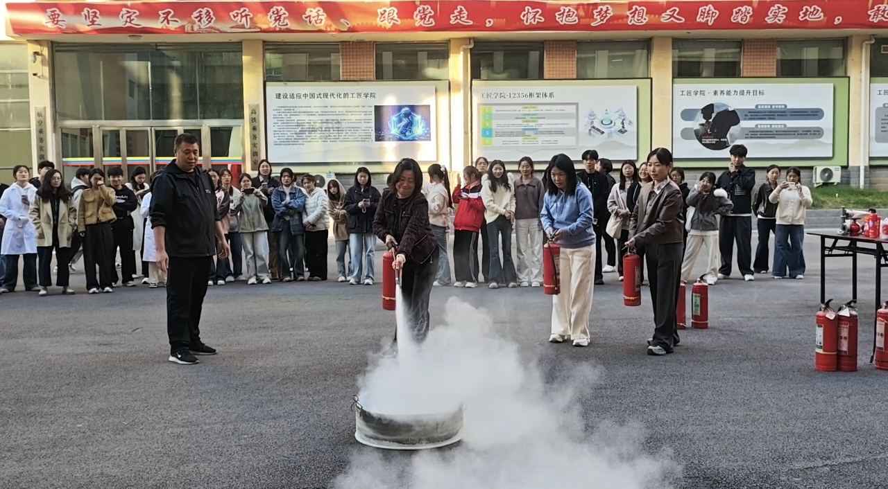 与此同时,学院楼下的主会场面向全体教职工及2024级学生代表开展实操培训。学校保卫处消防专干现场介绍了消火栓、报警器等常见消防设施的使用方法及注意事项。培训重点为灭火器实操演练,消防专干现场演示干粉灭火器的正确操作步骤——“提、拔、握、压”,并强调使用时的站位、风向判断及喷射要点。随后,师生代表分批次上前,亲手操作灭火器扑灭预设明火。大家态度认真、操作规范,通过实践有效增强了对火灾的应对能力,克服了恐惧心理。