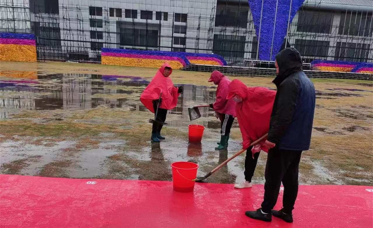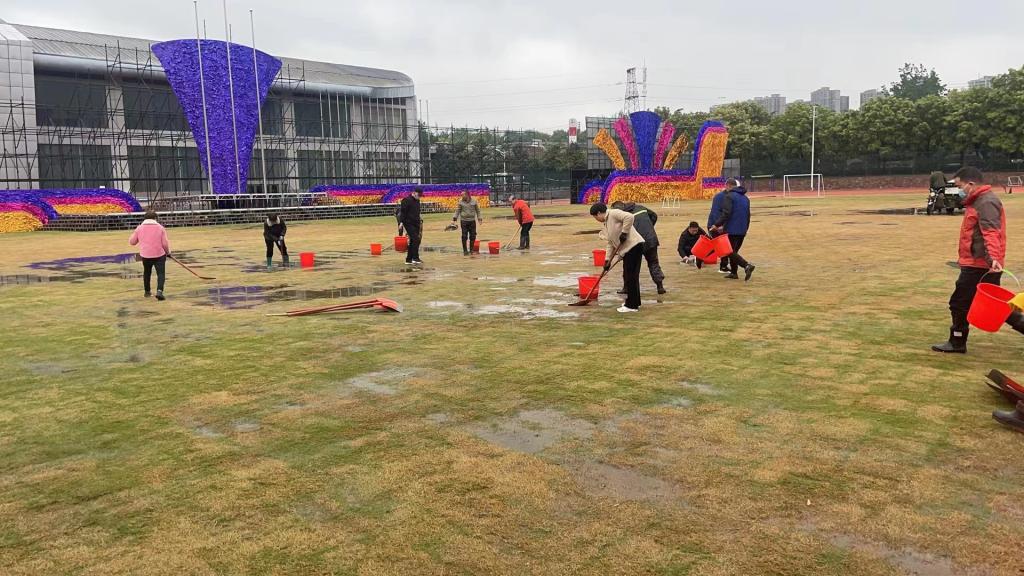 近日,集团首届职工运动会开幕式即将在学校举行。连日来的阴雨天气,造成学校操场草坪积水,给学生运动和开幕式的举办带来不便。