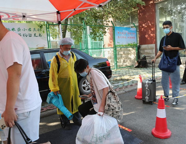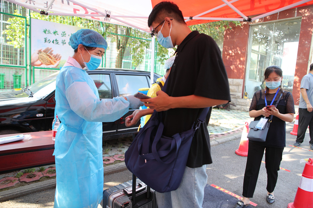 此次演练分为学生返校、新生报到、公寓内突发应急处置等6个场景。在学生报到演练现场,学校设有消杀区、测温区、核验区、隔离区等,返校学生保持一米间距依次进入报到通道,完成测温、查验行程卡、健康码、48小时核酸检测报告、14天体温记录等流程后,进入校园。在应急处置环节,首先演练了在报到区域发现学生健康码或行程卡异常的情况,由工作人员工作人员立即向现场疫情防控责任领导汇报,并联系现场医务人员把该同学带入临时观测点观察,并同时立即向校区疫情防控总指挥汇报,由校区疫情防控总指挥宣布启动疫情防控预案,同时向学院疫情防控办汇报出现的异常情况。经询问和检查,该同学核酸检测呈阴性,健康码、行程卡均显示正常,也没有中高风险旅居史,可能是心理紧张导致体温异常。在临时观测点,经过休息,该同学连续两次体温测量,均在正常范围内,该同学被允许报到入校,由校区疫情防控总指挥宣布解除预警。