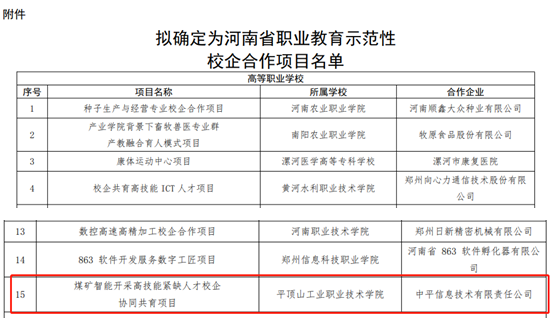 10月15日,河南省教育厅关于河南省职业教育示范性校企合作项目评选结果进行公示,由我校和中平信息技术有限责任公司联合申报的煤矿智能开采高技能紧缺人才校企协同共育项目成功入选。
