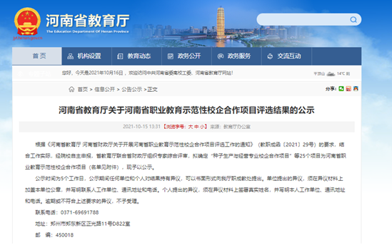河南省职业教育示范性校企合作项目评选旨在深化我省职业教育产教融合、校企合作,促进校企“双元”育人,提升技术技能人才培养水平。本次河南省职业教育示范性校企合作项目共评选25个,高职院校项目15个,项目要求全省职业院校的校企合作能够起到引领、示范和带动作用,并且成果可为省内其他职业院校开展校企合作提供学习和借鉴,并可成功复制。