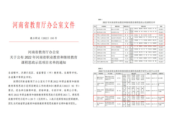 近日,河南省教育厅《关于公布2022年河南省职业教育和继续教育课程思政示范项目名单的通知》(教办职成〔2022〕195号)发布,我校课程思政教学研究中心获批2022年河南省职业教育和继续教育课程思政教学研究示范中心,《机电设备流体传动技术》《中国传统文化》等4门课程被认定为2022年河南省职业教育和继续教育课程思政示范课程。