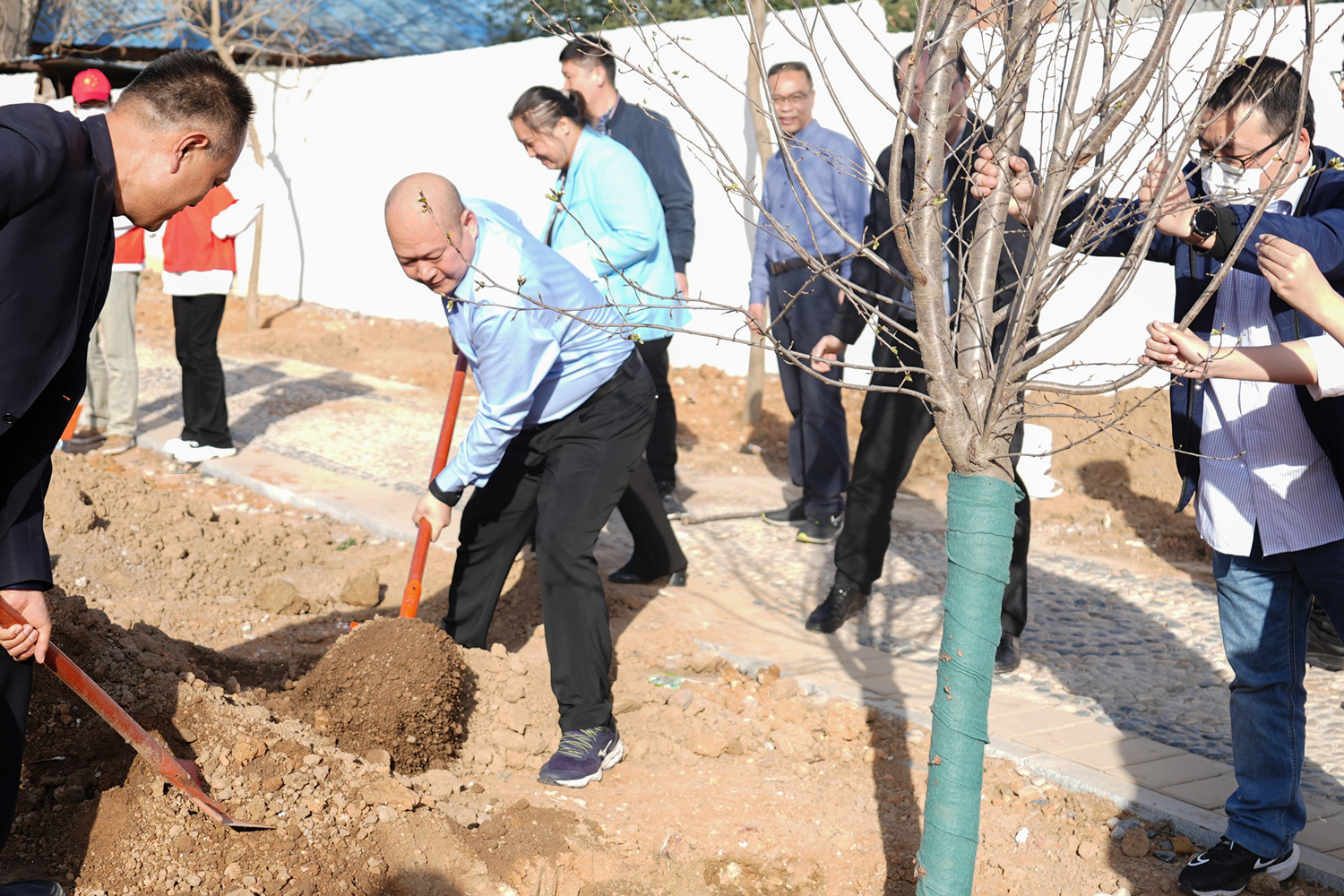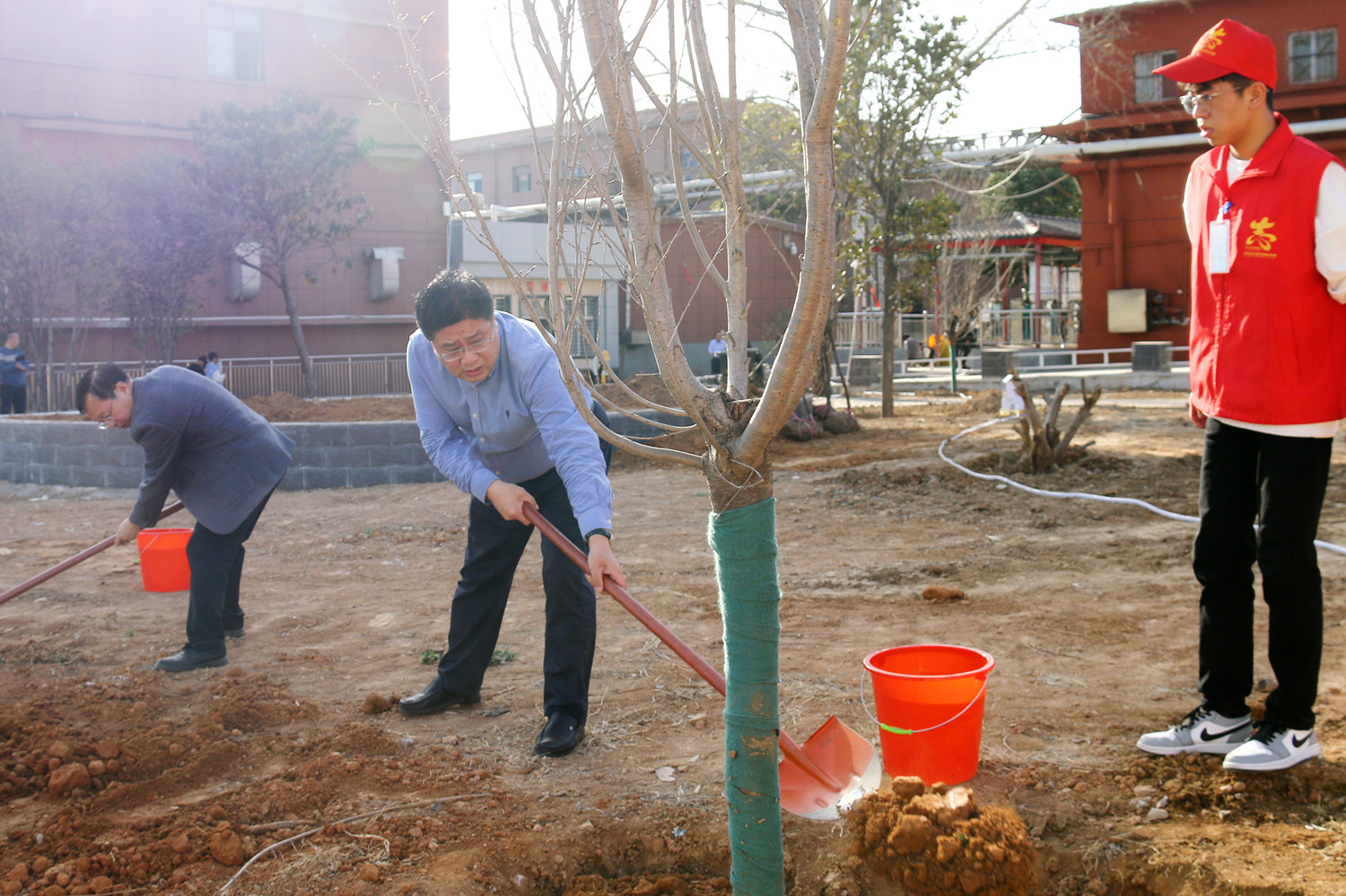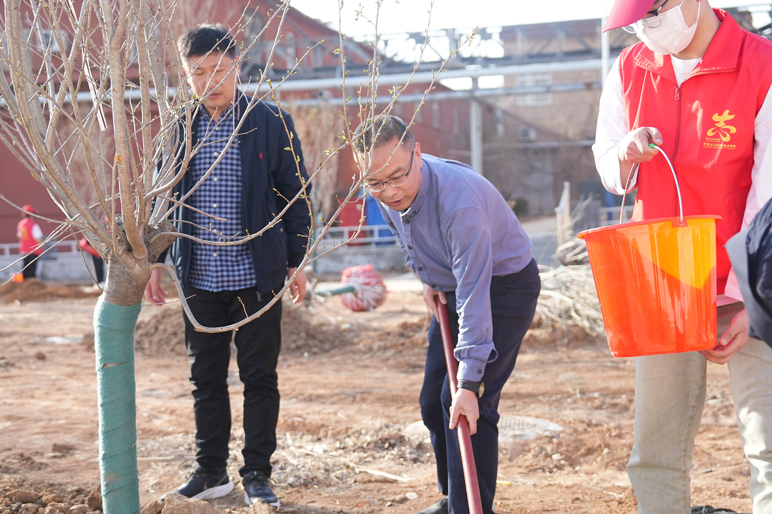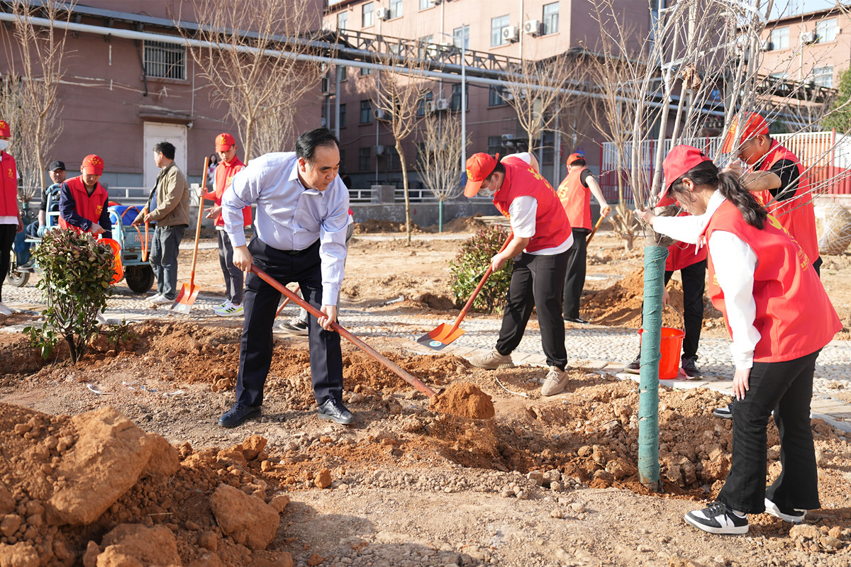 当天下午4点,在校党委书记毕晓阳、校长李树伟的带领下,校党委常务副书记、工会主席刘翱翔,副校长李新玉、杨立峰等领导来到植树现场,与同学们一起挥锹挖土、填培踩实、扶枝剪叶。一株株寄予着美好希望和活力新生的树苗被种下,展现出勃勃生机,为文化校园增添了一抹翠绿,期待着明年的春暖花开、绿树成荫。
