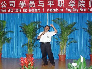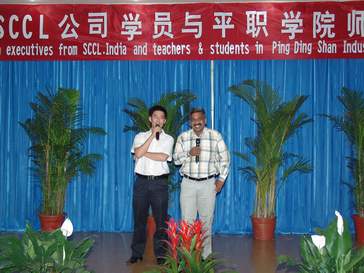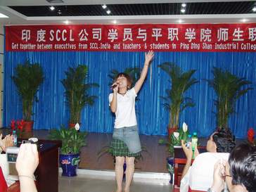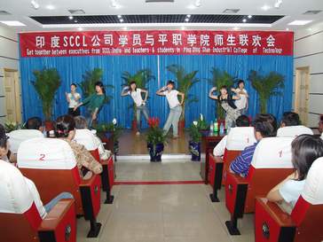 党委副书记郑运廷致欢迎词时说,中印两国文化交流源远流长,我国唐代高僧玄奘法师不远万里到印度取经,带回和传播了印度的佛教文化;今天,印度辛格南尼(SCCL)煤炭公司中层干部培训班的学员们,又不远万里来到中国,学习大倾角采煤技术,成为两国人民文化和科学技术交流的佳话。在阵阵掌声中基础部商务英语专业的同学们载歌载舞,用热情洋溢的歌曲和活泼热力的舞蹈表达了对到场来宾的欢迎。动听的歌曲,优美的舞蹈,感染了在场的所有观众。辛格南尼(SCCL)煤炭公司的学员,在团长劳拉·苏迪卡的带领下,一个个禁不住走上舞台献歌助兴,与同学们同歌共舞,将全场的气氛一次次推向高潮。