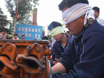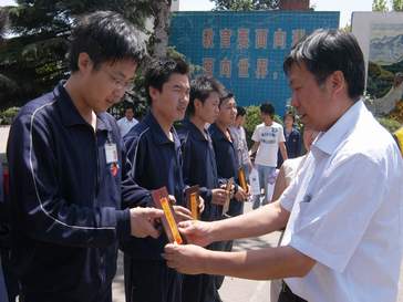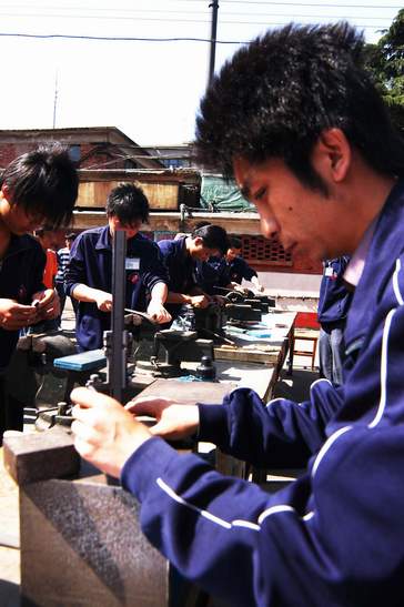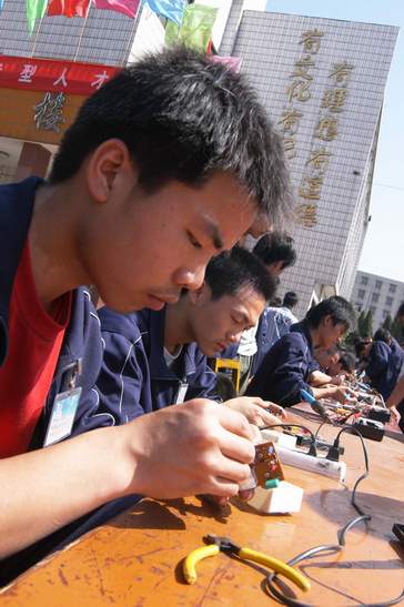 88名全副“武装”的同学在操场上拉开阵势,或磁力器蒙眼装芯板,或电子线路限时装配,或平敷焊焊接,或起重绳索解扣,或滤式自救器的使用操作……,5月18日,在学院北校区举行的“未来青工”技能大赛决赛场面气氛热烈,煞是精彩。尤其是蒙眼为磁力器安装芯板的比赛,各位平时在足球场、篮球场上生龙活虎的棒小伙,此时神情专注宛如清秀灵巧的绣花女,“穿针引线”,不一会就示意评委安装完毕。他们娴熟的技能赢得满堂喝彩。