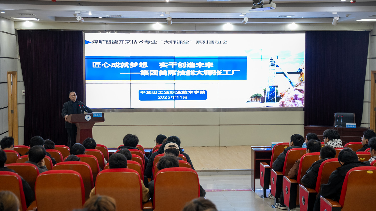 本次课堂特邀中国平煤神马集团首席技能大师、全国五一劳动奖章和中原大工匠获得者、学校94级杰出校友张工厂授课。他以数十年深耕煤炭行业的亲身经历,以“匠心成就梦想 实干创造未来”为主题,为现场师生带来了一场兼具深度与温度的行业盛宴。