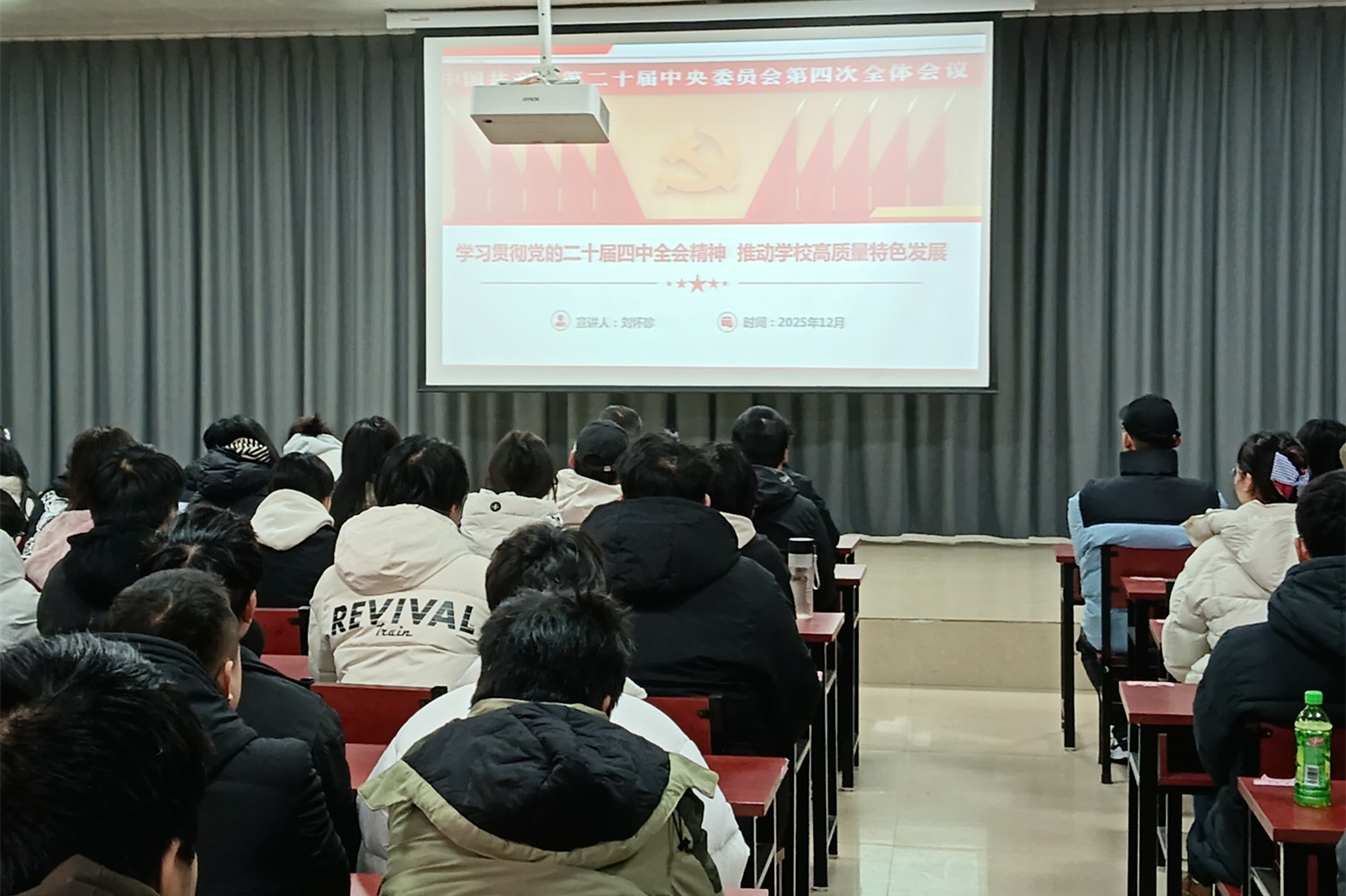 12月31日下午,副校长刘怀珍以《学习贯彻党的二十届四中全会精神推动学校高质量特色发展》为题,为技师学院师生代表讲授了一堂兼具理论深度、历史厚度与实践温度的思政课。