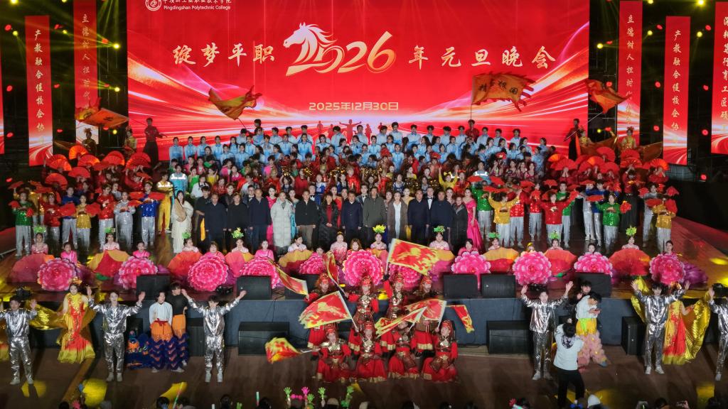 灵蛇曼舞辞旧岁,骏马奔腾迎新春。12月30日晚,学校在体育场隆重举行“绽梦平职”2026年元旦晚会。校长李树伟出席并致辞,集团工会、集团党委宣传部相关负责人应邀出席,学校校友代表、全体在家校领导及全校师生现场观看,晚会同步线上直播,线上线下观看人数达5万余人。晚会分为“梦·溯光”“梦·深耕”“梦·炽绽”“梦·远征”四个篇章,涵盖了舞蹈、合唱、情景剧、朗诵等各具特色、形式多样的表演形式,展现了全校师生以梦为马,砥砺前行的精神风貌,表达了师生对新时代未来的美好憧憬。