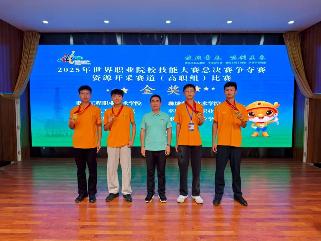 8月25日至28日,2025年世界职业院校技能大赛总决赛争夺赛资源开采赛道(高职组)在内蒙古化工职业学院圆满落幕。由学校副校长张立方带队,资源开发学院李俊堂、高争、孙欢欢、房耀洲、田国良、曹一哲等专业教师指导,贾博文、张任钰、黄江涛、张永杰四位同学组成的参赛团队,凭借卓越表现勇夺大赛金奖。这也是学校继2024年荣获该赛事金奖后再度摘金。