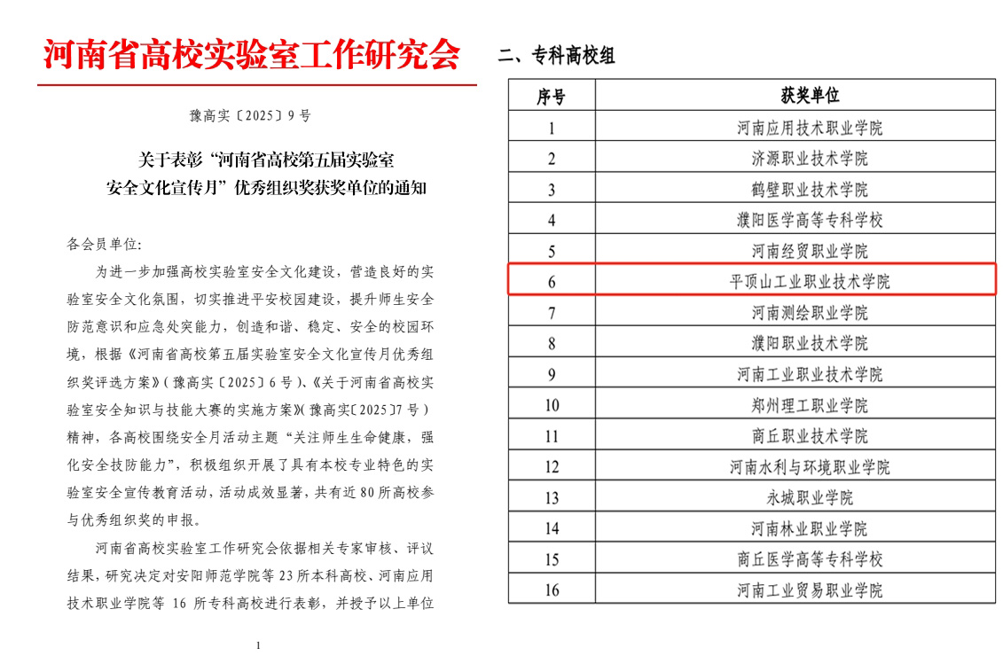 近日,河南省高校实验室工作研究会正式印发《关于表彰“河南省高校第五届实验室安全文化宣传月”优秀组织奖获奖单位的通知》(豫高实〔2025〕9号),我校凭借周密部署、扎实推进的活动组织工作,成功斩获优秀组织奖。这也是自该活动举办以来我校连续第五次获此殊荣。