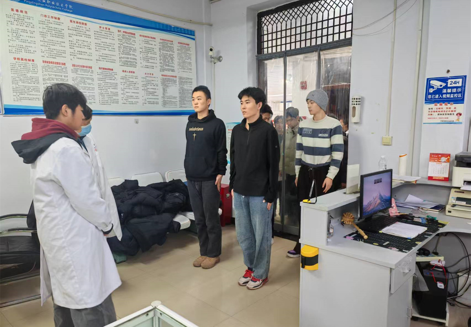 为保障初检工作的专业性与严肃性,武装保卫部积极与校卫生所沟通协调,制定详细的初检实施方案,明确流程分工,责任到人。体检现场设置身高、体重、视力、外科等专项检查区域,配备引导员全程分流引导。现场队列整齐,秩序井然。工作人员严格按照征兵体检标准和流程,恪尽职守,规范操作,对应征青年进行细致检查,精准记录,严把兵员质量第一关,确保了初检工作的科学、公平、公正。武装保卫部工作人员实时解答学生关于体检项目、后续流程的疑问,提供专业指导,确保初检工作高效、有序、暖心推进。