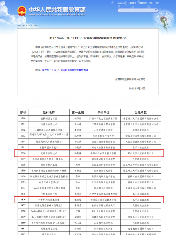 近日,教育部发布《关于公布第二批“十四五”职业教育国家规划教材书目的公告》,我校2部教材入选国家规划教材名单,分别为孙慧峰老师主编的《变频器应用技术》和张麦玲老师主编的《计算机网络技术基础》。