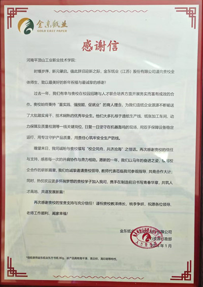 近日,金东纸业(江苏)股份有限公司向我校发来感谢信,对学校在人才输送和校企合作方面给予的支持致以诚挚谢意。