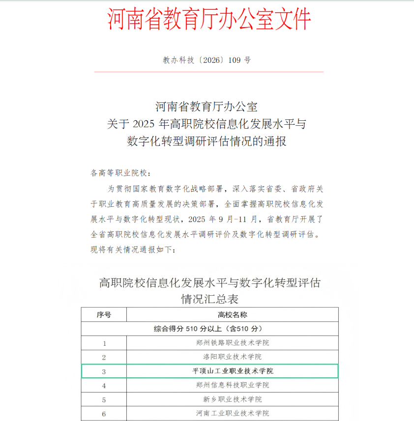 近日,河南省教育厅办公室正式印发《关于2025年高职院校信息化发展水平与数字化转型调研评估情况的通报》(教办科技〔2026〕109号),我校凭借在信息化建设、数字化转型、网络安全保障等方面的突出成效,获评优秀,综合建设水平稳居全省高职院校前三。