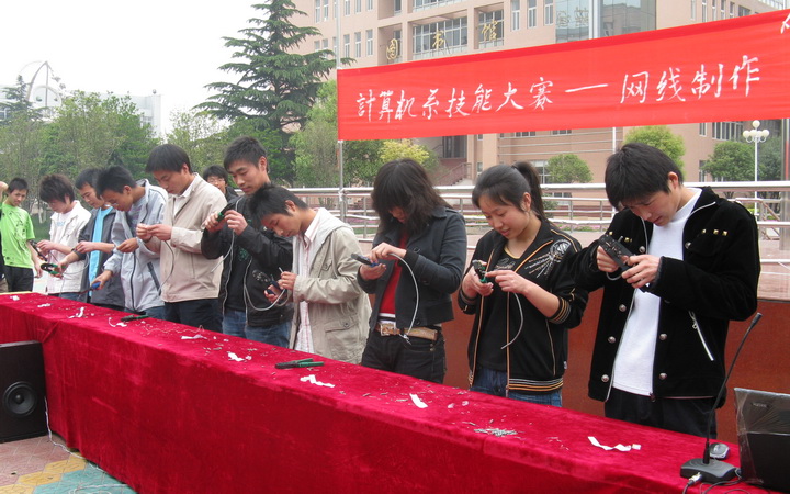 4月14日中午,为提高学生实际动手能力,促进理论与实践结合,计算机系在升旗广场举行了网线制作技能大赛。来自该系计算机应用、计算机网络技术等专业的104名学生参加了角逐。