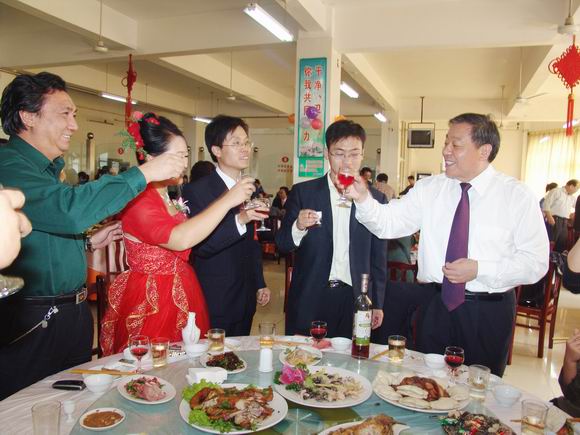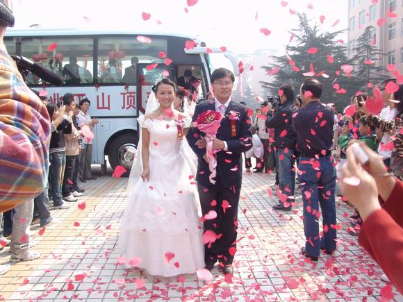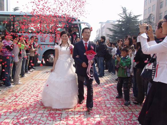 婚礼现场,曾因携病母求学,获得平顶山市“鹰城十大孝星”称号的范长春,始终掩饰不住内心的激动,他在学院工会工作,他的新婚妻子刘俊文在学院学工部做学生社团管理工作。范长春说,作为学院的毕业生,现在又在学院工作,是学院培养和造就了我。结婚是人生的一大喜事,特别是能在祖国生日的这一天,学院领导为我们举行盛大的集体婚礼,更是让我从心底里感到激动和自豪。而学院资源开发系和基础部的温福星、刘佳两位新人,面对簇拥而来的学生,在祝福声中幸福挂满了绽放的笑脸。婚礼仪式上,学院党委副书记郑运廷、工会主席王任远等领导为12对新人致辞、证婚,院长仵自连亲手将5000元的大礼包送到每一对新人的手中,勉励他们在将来的生活中,发扬中华民族的优良传统美德,崇尚节俭,倡导文明,共同建立好温馨幸福的家庭,为学院的快速发展,为祖国的和谐昌盛贡献青春和力量。(魏宏伟/文 张庆新/图)