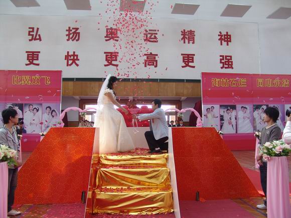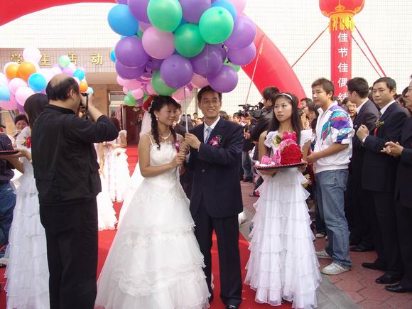 上午10:00,12对新人分别从学生傧相手中接过12把同心锁,共同把象征爱情甜蜜的同心锁锁上后,分别将钥匙系在每束由99支五彩气球组成的丝带上,把对未来美好的祝愿放飞蓝天,让云为媒,天为证。随后,伴随着喜气洋洋的乐曲,身着婚礼盛装的12对新人款款步入集体婚礼现场。喜气、欢乐、幸福荡漾在每一对新人的脸上,学院师生及礼宾们放纵着手中的礼花,无数的心形花片洒向每对新人的身上,向他们表示深情的祝福。新郎、新娘在亲友、师生们的陪伴下,在来宾们的祝福声中,随着纷扬飘洒的婚庆彩花,走上红地毯,步入婚姻的神圣殿堂。