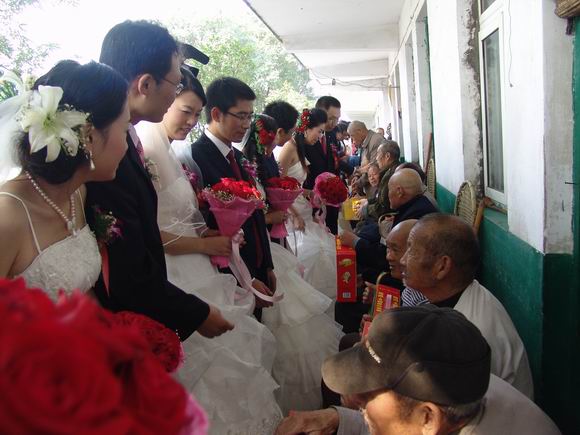 国庆佳节,适逢重阳临近,尊老敬老是中华民族传统美德,上午9时许,12对新人来到了平顶山北渡乡敬老院,给那里的孤寡老人们送去节日的祝福。当一对对新人把手中的慰问品送到老人们手中的时候,新老两代人和睦融洽的景象早已定格在摄影师的镜头里。孤寡老人张天庆说,今天真高兴,这么多人来看我们,祝你们白头偕老,新婚幸福。