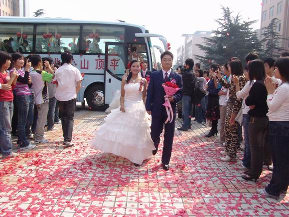 为做好迎新工作,专门把学院的一辆通勤大轿车打扮的花团锦簇。清晨,当花车驶过市区,虽然没有明星的耀眼,但迎新花车还是相当吸人眼球。路人纷纷驻足观望,家属楼、办公楼里的人们纷纷打开窗户,人们的眼里是惊奇也是感叹,更多的是用微笑表示祝福。迎新车道上,行驶的车辆也纷纷为花车让道,用短促的车笛声为新人奏响幸福的旋律。