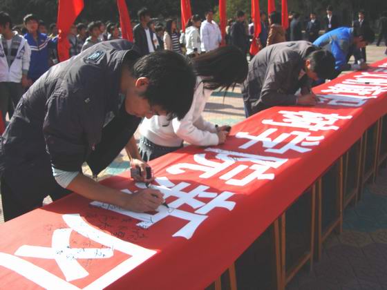 本网讯(通讯员 白红军)11月12日中午,学工部在升旗广场举行“加强校风校纪建设、构建和谐美好校园”签名仪式。院学生会、风纪督察队以及各院系学生干部代表300名同学代表两万余平职学子写下誓约,立下心愿:“勿以恶小而为之,勿以善小而不为。从我做起,从身边小事做起,严格自律,做一个文明的平职人。”